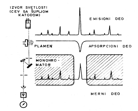 Da bi se mogla meriti atomska apsorpcija, potrebno je imati monohromatski izvor svetlosti stalnog intenziteta rezonantne talasne dužine za određeni element, čija je polutalasna širina manja od polutalasne širine atomske apsorpcione linije. Ove zahteve izvora svetlosti zadovoljava cev sa šupljom katodom. Pod ovakvim uslovima tačnost merenja ne određuje monohromator, u atomskom apsorpcionom spektrofotometru već kvalitet cevi sa šupljom katodom (ili drugi odgovarajući izvor svetlosti) i tačnost merenja intenziteta propuštene svetlosti nakon atomske apsorpcije. Monohromatori obično propuštaju traku monohromatskog zraka čija je polutalasna širina oko 0,5 nm, dok je polutalasna širina atomske apsorpcione linije oko 0,01 nm. Time je uloga monohromatora svedena samo na izolovanje rezonantne linije iz „okoline“, što je i šematski prikazano na Slici 1.1.